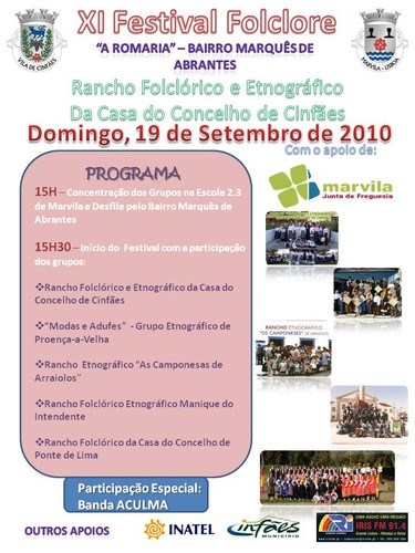 Óra cá está o nosso cartaz! Ficou bem giro! A Ana e o Duarte fizeram um excelente trabalho! Excelente vai ser também o nosso XI Festival, por isso livrem-se de faltar. Vamos ter ao nosso lado grupos folclóricos e etnográficos de grande qualidade, com os quais temos vindo a desenvolver parcerias, por isso acho que vai ser um belíssimo espectáculo. Claro que não posso deixar de referir que vai estar também presente o grupo da minha terra "Modas e Adufes - Grupo Etnográfico de Proença-a-Velha", o que significa que eu vou estar duplamente orgulhosa, não só pela bela festa que vai ser, mas também por ver representadas em simultâneo com as tradições da terra do meu marido, as minhas próprias tradições, por gente da minha aldeia.