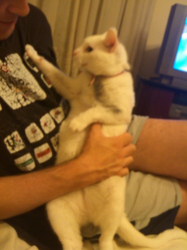 Cá em casa é costume o quadro da luz eléctrica desligar-se, a instalação do prédio não suporta um aumento de potência, e por isso quando ligamos muitos electrodomésticos ao mesmo tempo a coisa acontece. No outro dia, estávamos nós a acabar de almoçar, apenas a luz da cozinha e uma televisão acesa e o quadro: Puft! No ar um cheiro a queimado... andei a ver, tentei perceber de onde vinha o cheiro, nada... liguei o quadro, na sala não havia luz, descobri que um dos disjuntores estava também desligado, liguei tudo e pus tudo a funcionar. Passadas umas horas aparece-me a Lola, uma das nossas Bichanas, em cima da mesa da cozinha assim, como se vê na foto: toda chamuscada no peito e numa das patas! É que a Lola tem um problema: tem uma costela de rato. Deve ter sido ratazana numa outra encarnação e por isso diverte-se a roer fios eléctricos! Deve ter levado um choque e peras! O pior é que o nosso Vet diz que os gatos que roem fios eléctricos gostam da sensação do choque e o mais certo é que voltem a repetir a gracinha... Qualquer dia fica assada! Credo!